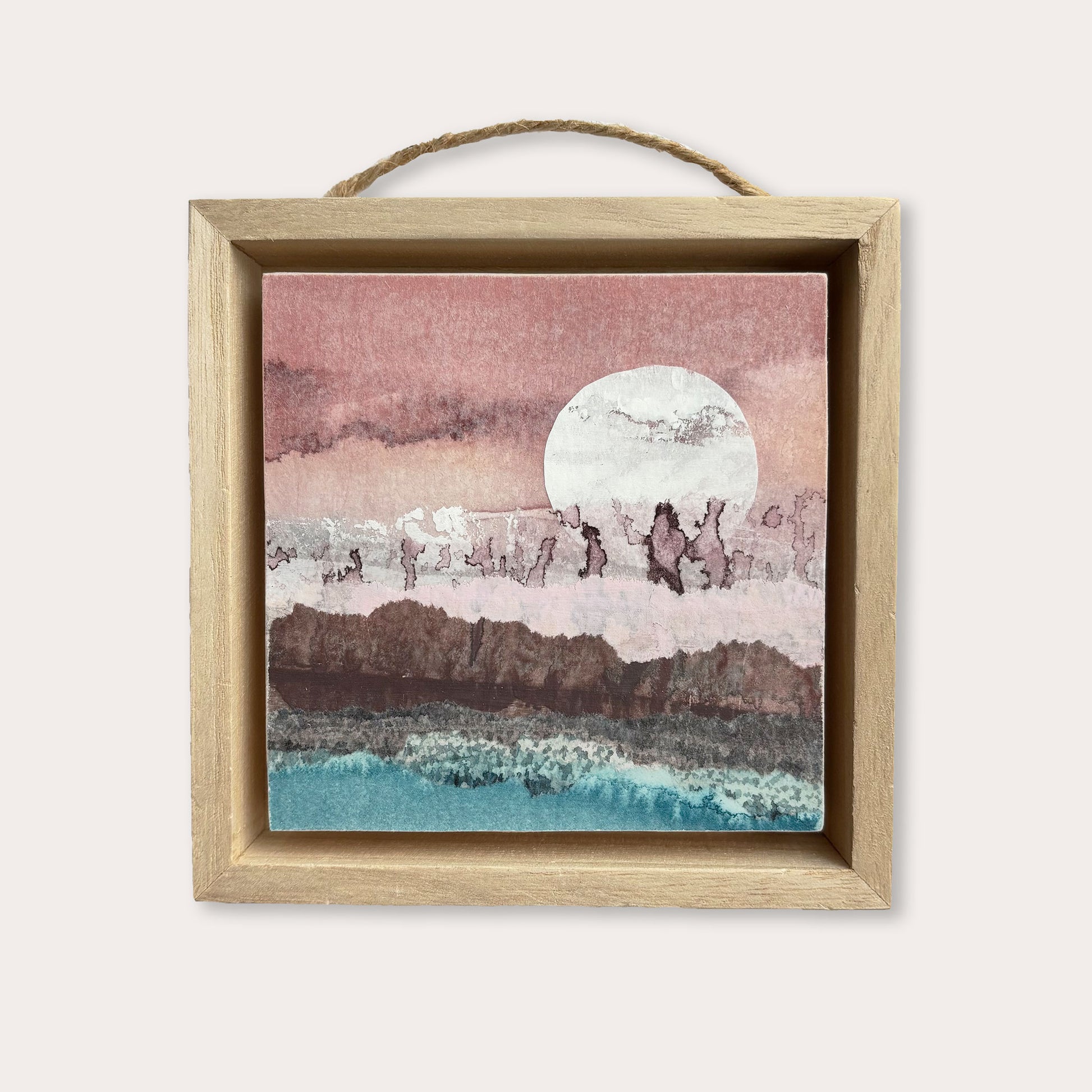 "Orchid Evening II" original mini landscape with acrylics, inks and translucent wax papers on wood panel by Lara Eckerman, 2025