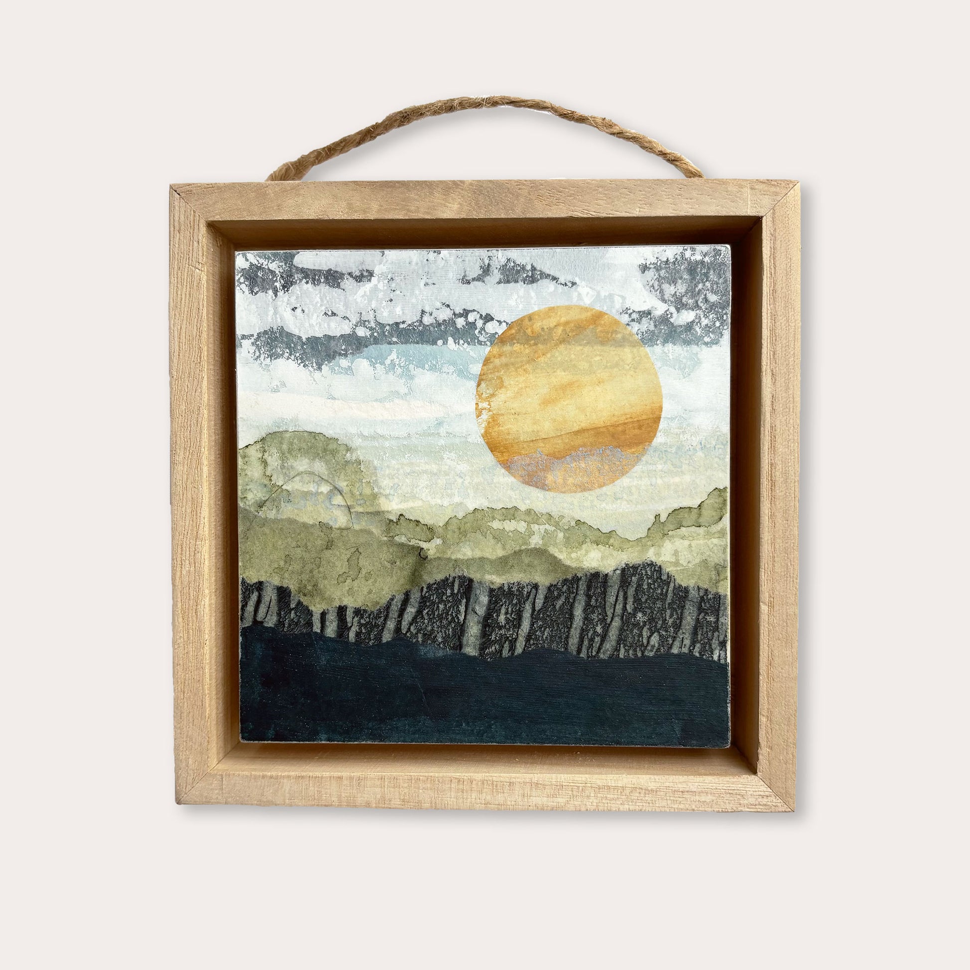 "Sunlit Basin II" original mini landscape with acrylics, inks and translucent wax papers on wood panel by Lara Eckerman, 2025
